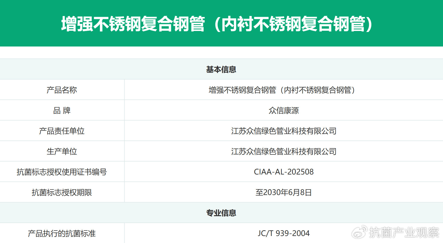 日前,江蘇眾信綠色管業(yè)科技有限公司研發(fā)生產(chǎn)的增強不銹鋼復合鋼管(內(nèi)襯不銹鋼復合鋼管)通過CIAA的嚴苛審核,獲得抗菌標志使用授權。增強不銹鋼復合鋼管(內(nèi)襯不銹鋼復合鋼管)獲得抗菌標志使用授權,這意味著其衛(wèi)生安全性能和抗菌性能達到業(yè)界最高技術追求,成為CIAA推薦的“安全且抗菌有效”的抗菌標志產(chǎn)品。